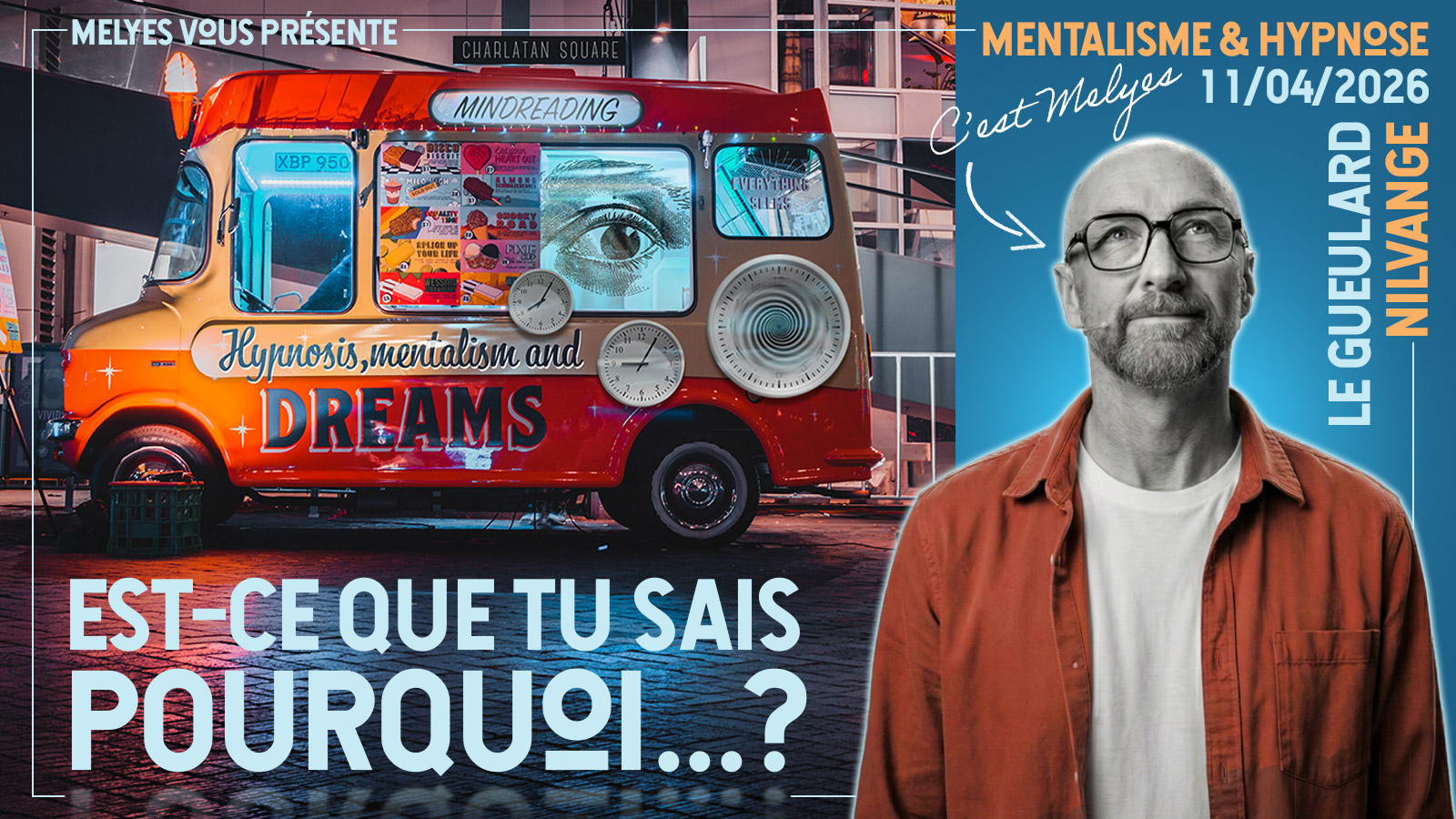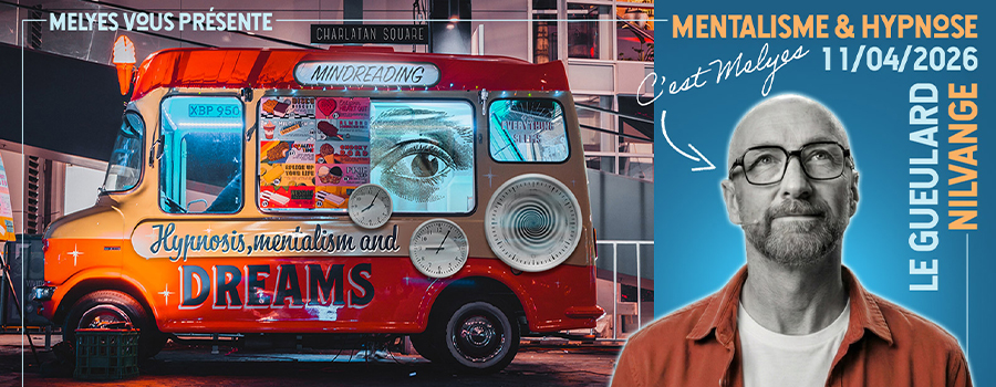 Est-ce que tu sais pourquoi tu es persuadé d’avoir raison alors que ton cerveau te mène en bateau ? Pourquoi une simple idée peut pirater tes sens ? Et surtout, comment ton voisin de droite a deviné le nom de ton premier poisson rouge sans même te regarder ? Entre mentalisme moderne et hypnose décontractée, Melyes joue les marchands de glaces hypnotiques et passe dans votre quartier pour chatouiller vos neurones, hacker vos certitudes et explorer vos super-pouvoirs cachés avec une bonne dose d’autodérision.